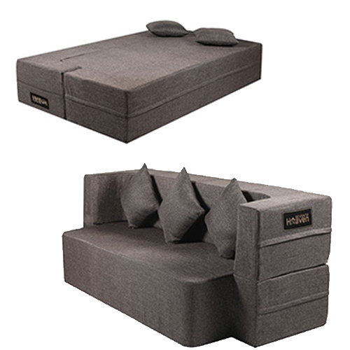 Bring home this chic sofa-cum-bed to liven up your living room! Featuring high-quality jute upholstery and firm foam, it can easily accommodate three people and comes along with two cushions as well.